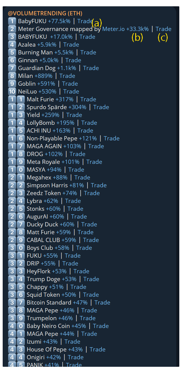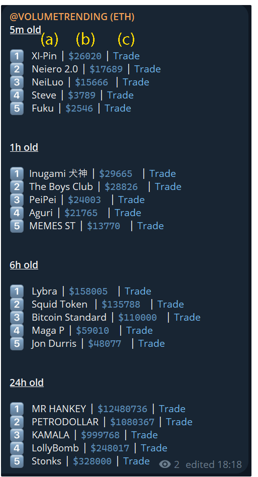 Volume trending based on creation timestamps, 15m, 1h, 6h & 24h ago pool creations and ranked 1-5 in terms of volume, here you can see the freshest of hot volume trending tokens and find alpha before its received any calls or entered any official volume trending channels.