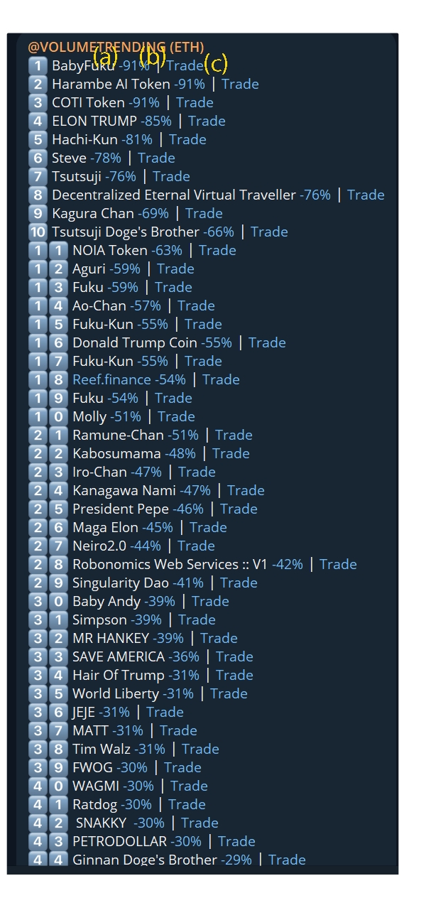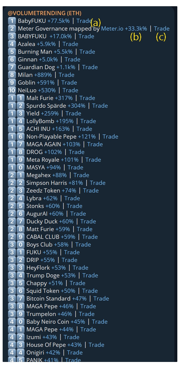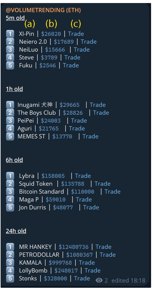 ago pool creations and ranked 1-5 in terms of volume, here you can see the freshest of hot volume trending tokens and find alpha before its received any calls or entered any official volume trending channels.