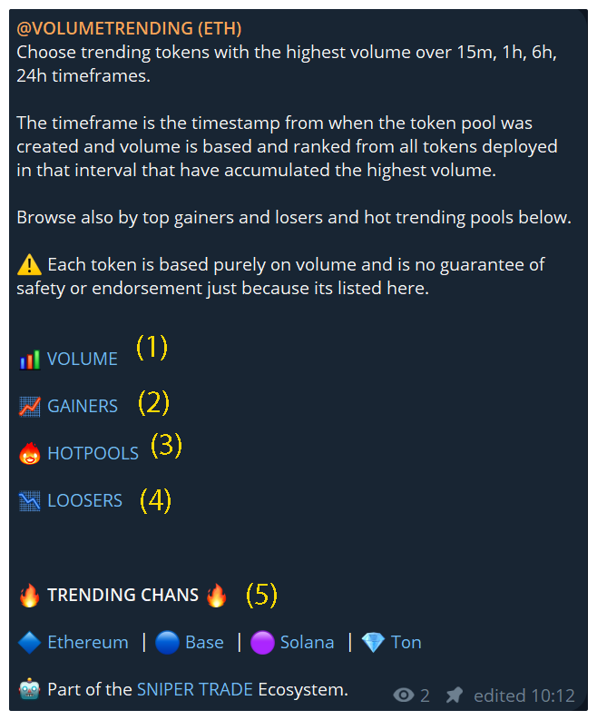 Finding trending tokens is one of the best way to find alpha and tokens that are currently hot in the market. There are several trending channels, they are currently paid but in any case are a good indicator of traction for a particular coin/token.