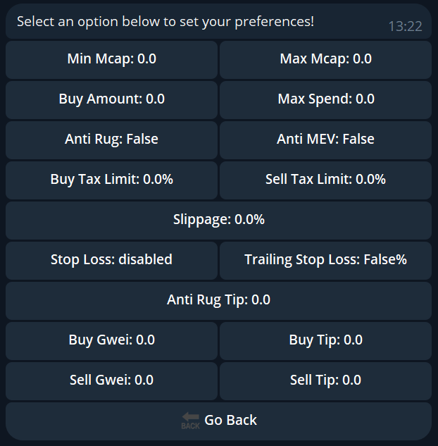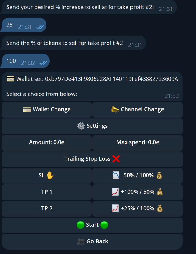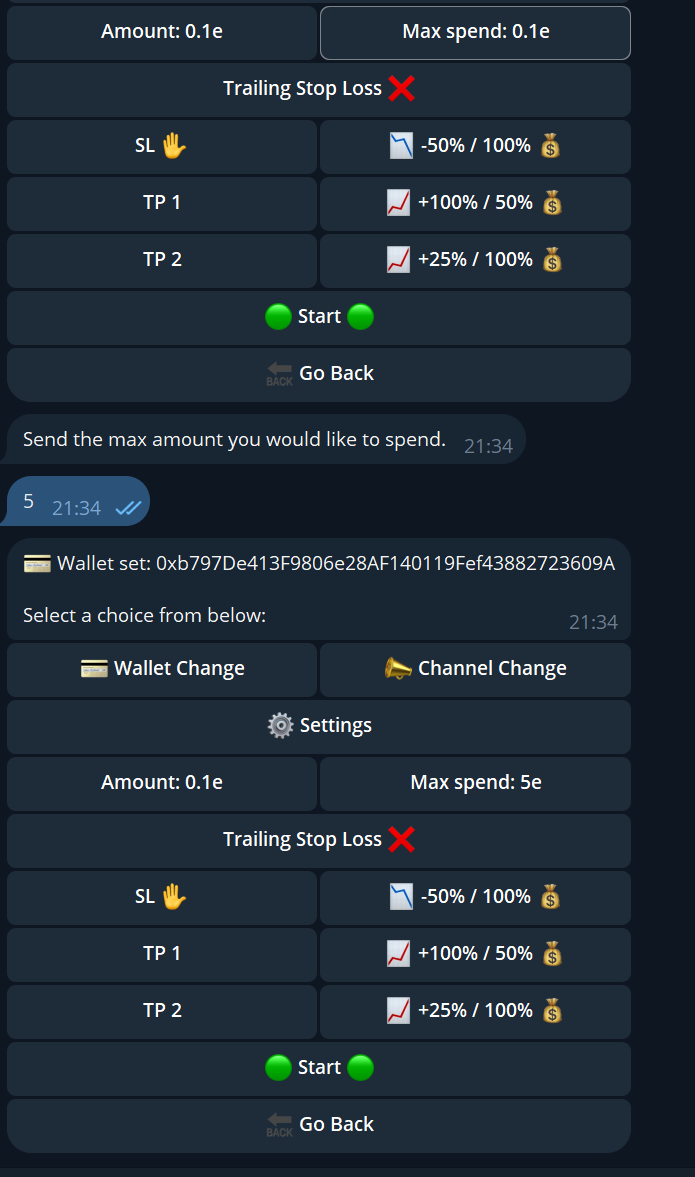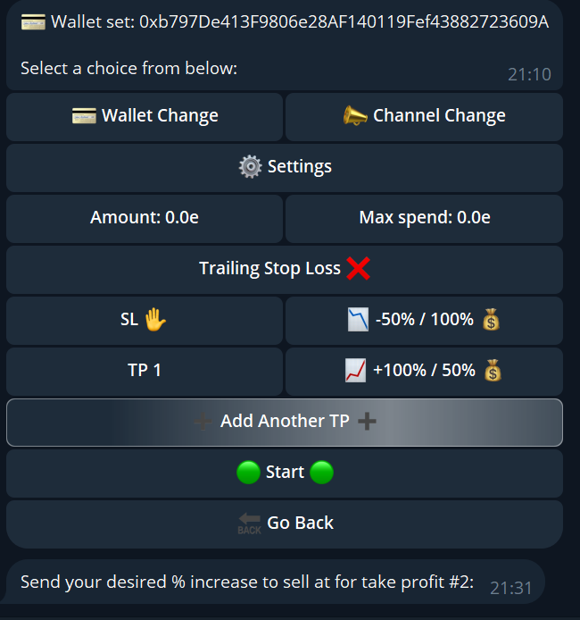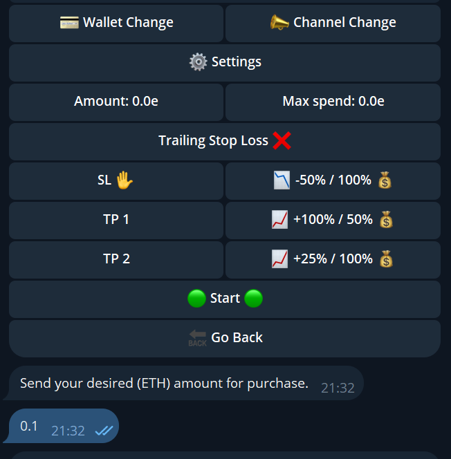 Change the amount per snipe, every new call will trigger a buy with this amount.