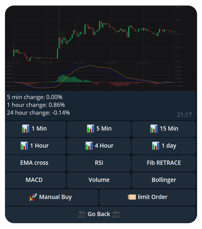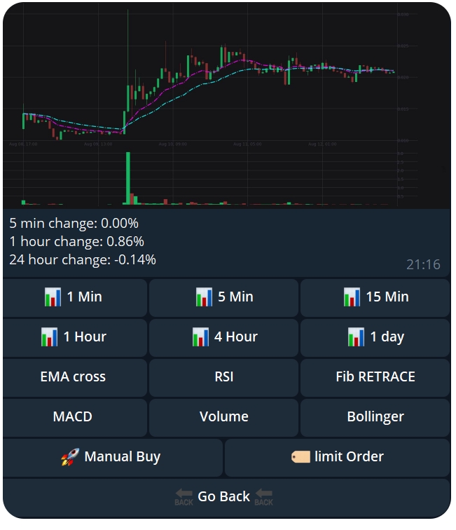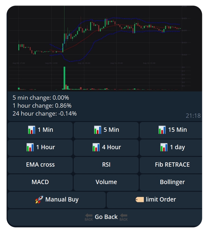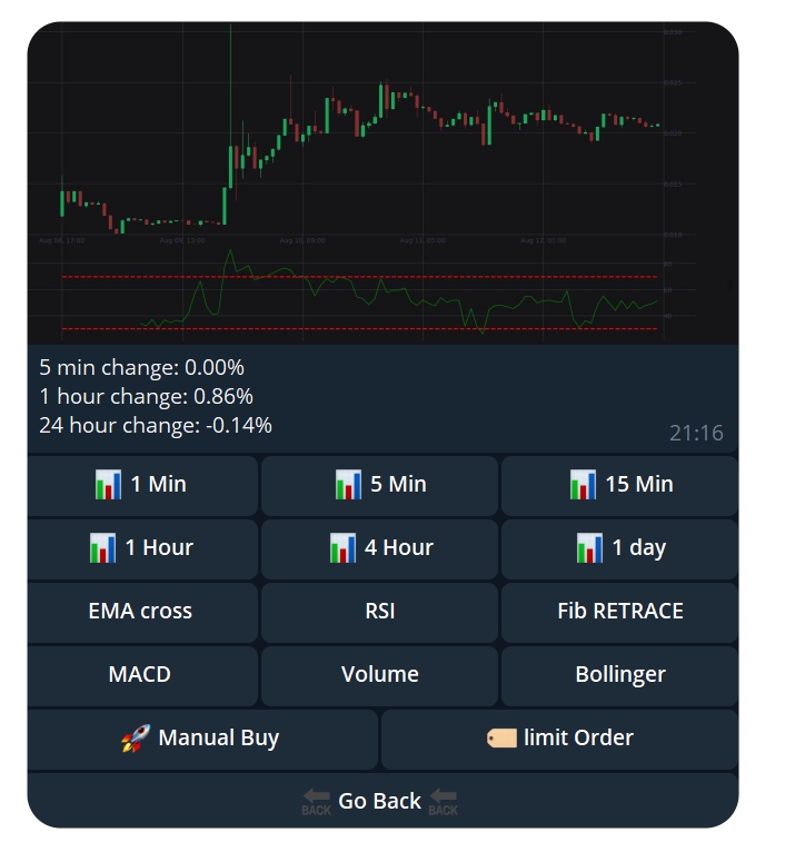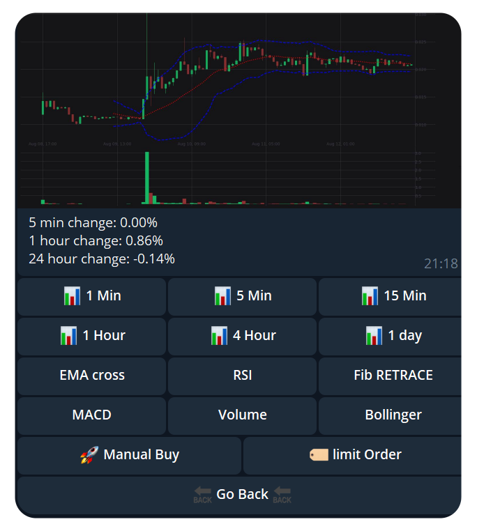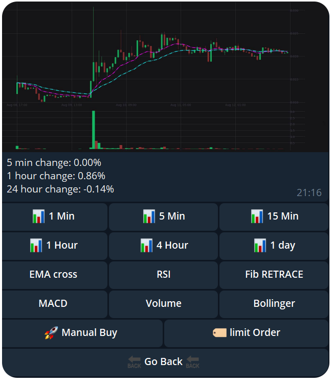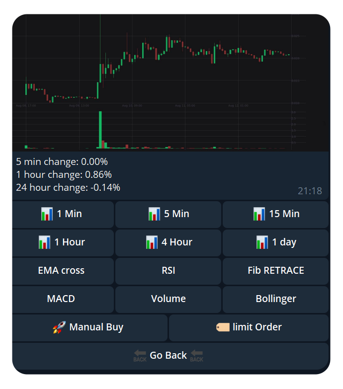 The Chart will load, and you can now select your desired timeframes and do technical analysis of the token right from the bot.