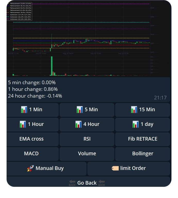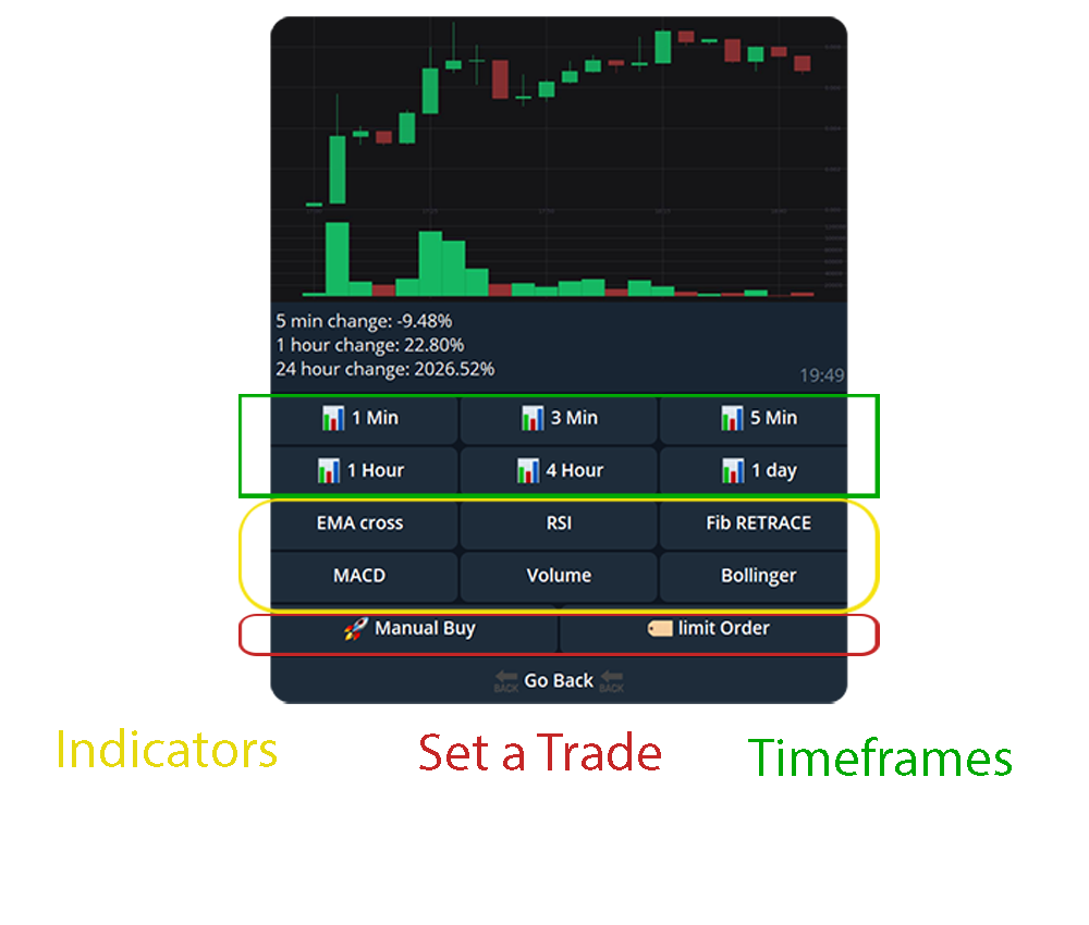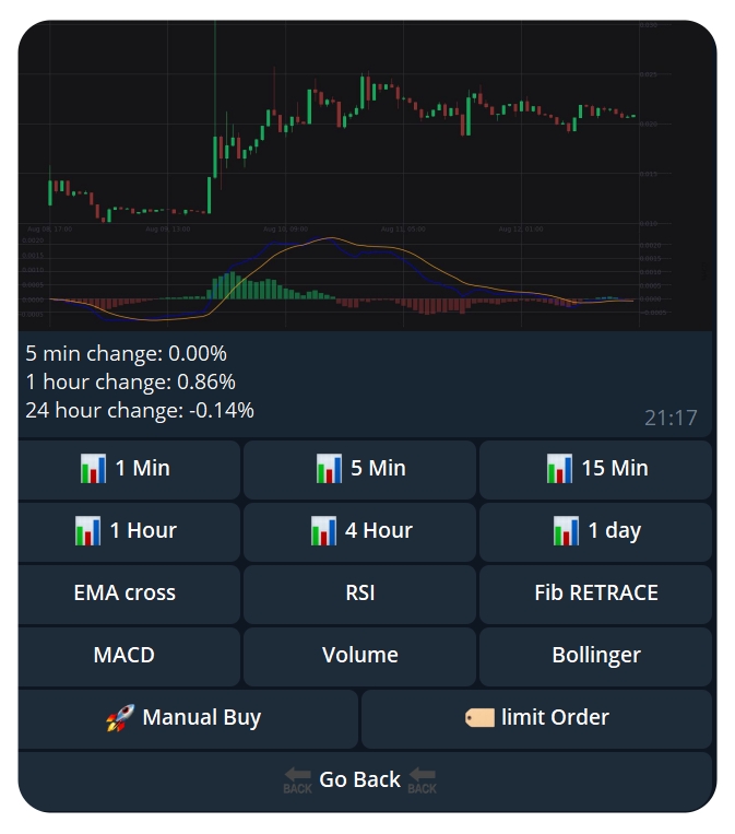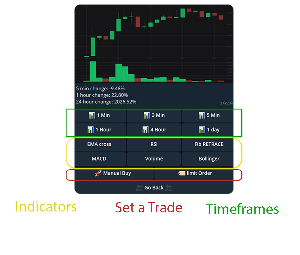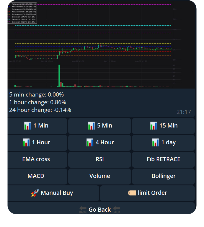 The Chart will load, and you can now select your desired timeframes and do technical analysis of the token right from the bot.