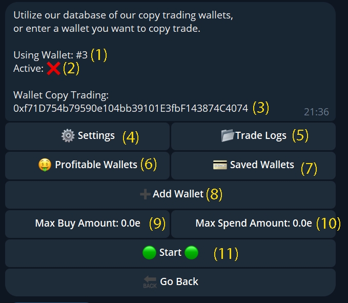 You can easily copy trade profitable wallets without ever lifting a finger. Just predefine the amount you are willing to spend, over how many trades and enter a profitable wallet you would like to copy and reap the benefits.