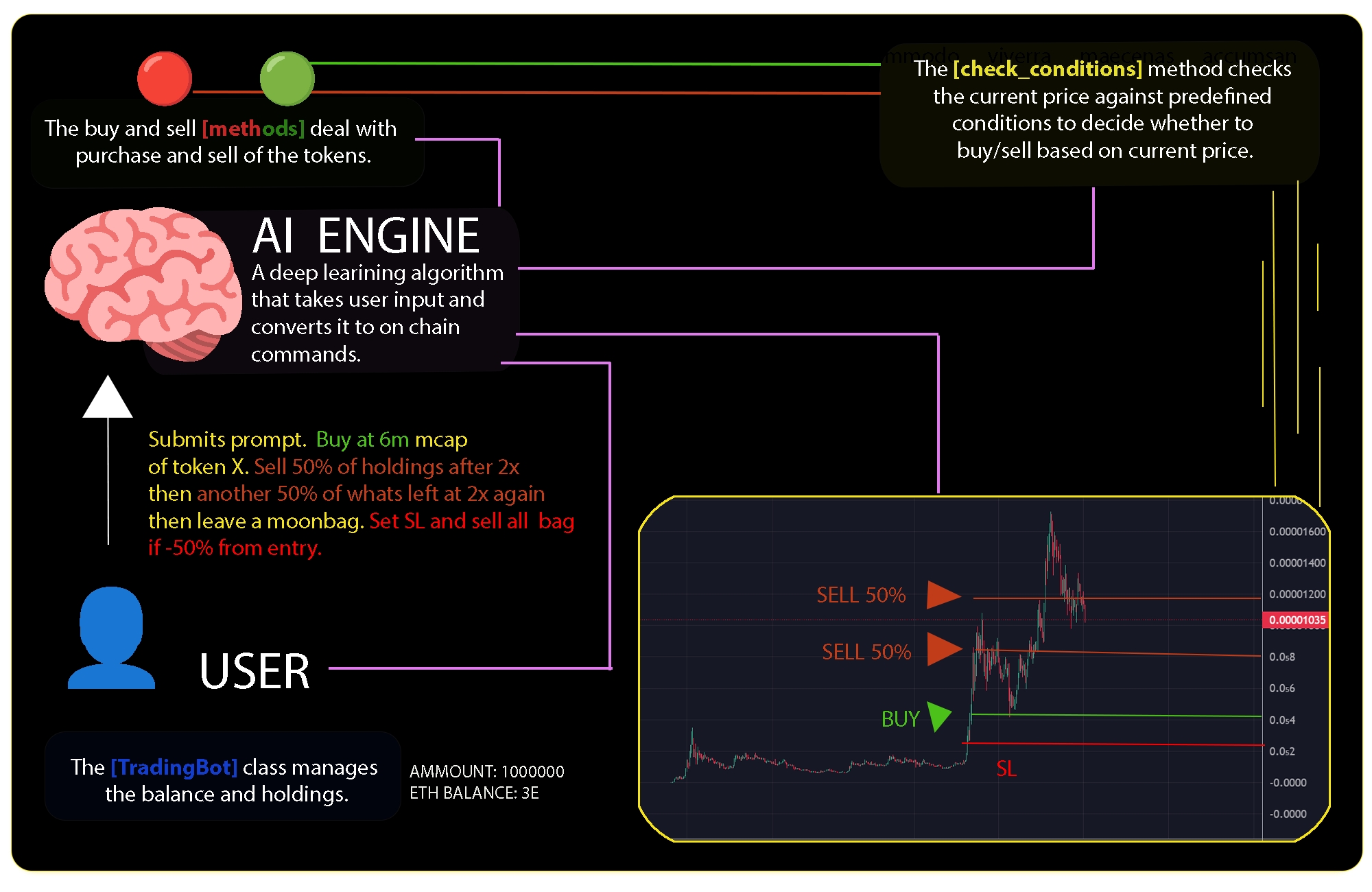 The AI Engine can be used to set complex multi-strategy executions by setting multiple SL, DCA orders, TP orders simultaneously on a particular token. This allows for better risk management and profit-yielding execution while also taking some risk away from emotional trading by pre-setting a strategy and letting it pan out without constantly having to check the chart and either FUD yourself out of the trade or do something irrational while swayed by greed, e.g not cashing out profits, which would not be a part of your proven profit taking logical decision.