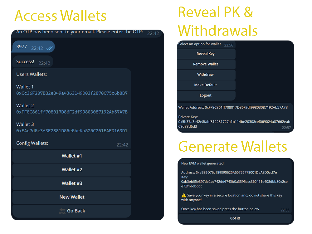 Protection Against Unauthorized Access: Even if someone obtains controll over the telegram account, they cannot access the sensitive info like PK or make withdrawals on the account without the additional verification code sent to the user's phone or email.