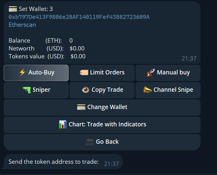 When Auto-Buy is clicked from the menu the bot will wait for you to paste the contract address and then automatically try to buy it with your preset settings such as amount, gas, slippage, anti-rug, min/max MCAP ect. Use with caution.