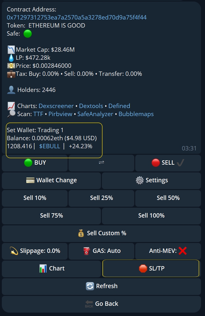Exactly same as buy interface but instead of the middle buttons being denoted as the value of ETH to buy they are now % ages that when clicked, will auto sell the amount of your bag total.