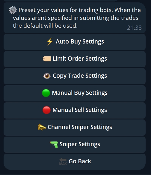 Each trading method will have its own set of settings as not to interfere with trading styles. In the next sections there will be 3 general sections with Safety, Gas & General. Some trading strategies may use all or some of the listed settings in each category.