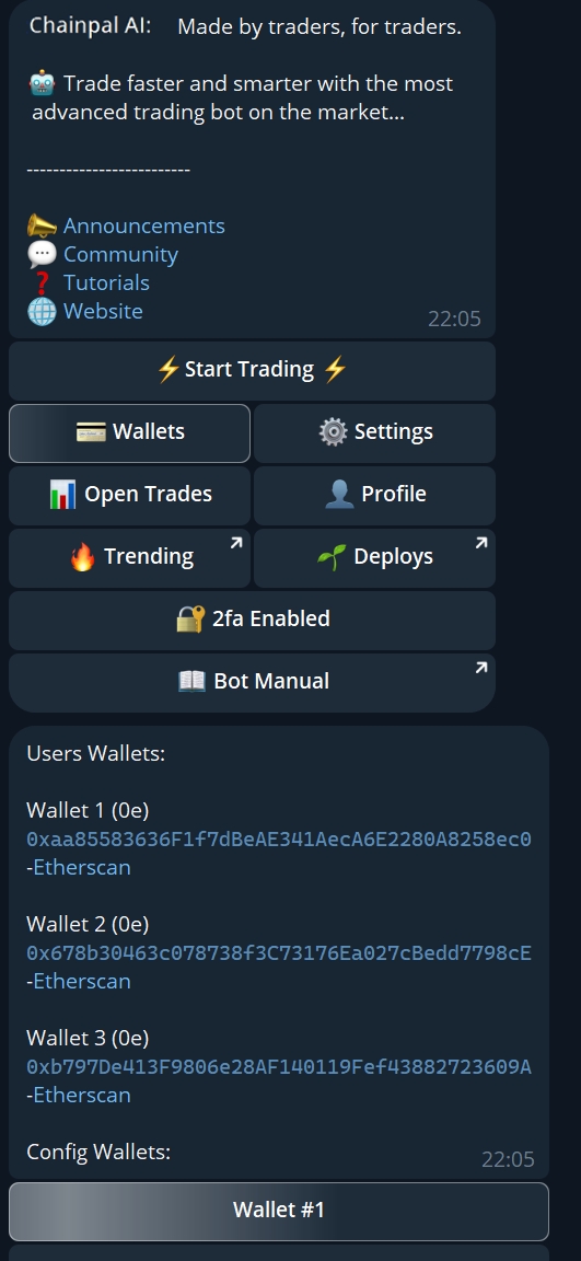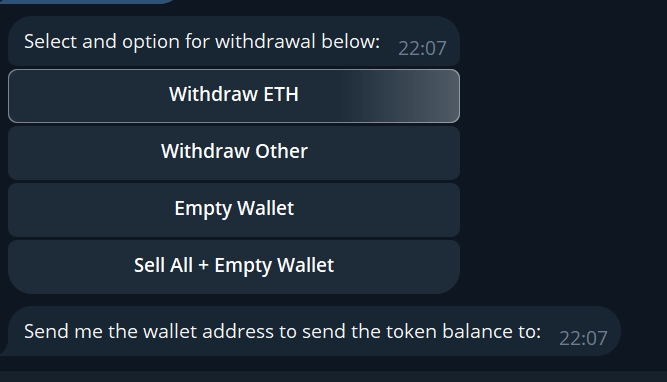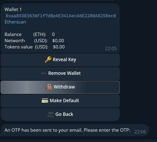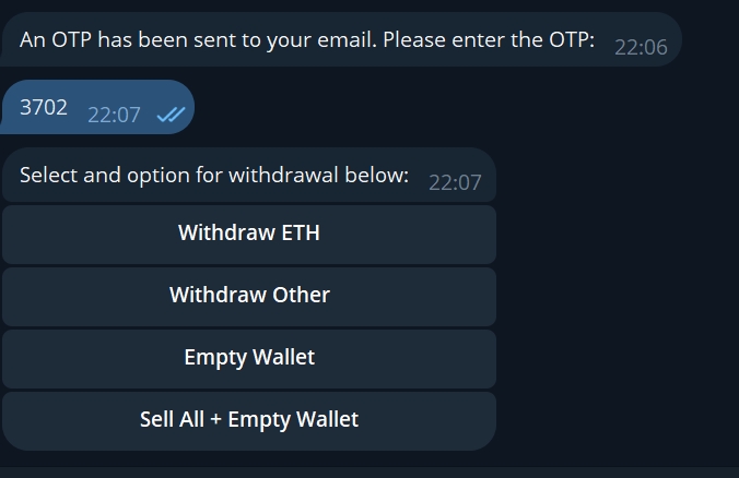 Enter the OTP to gain access to the wallet. Then choose weather to withdraw ETH, SOL, TON, ETH (Base) ect or the native token for the bot you are using withdraw Token (Other), empty entire wallet, base token and everything in it, or close all positions and empty the wallet.