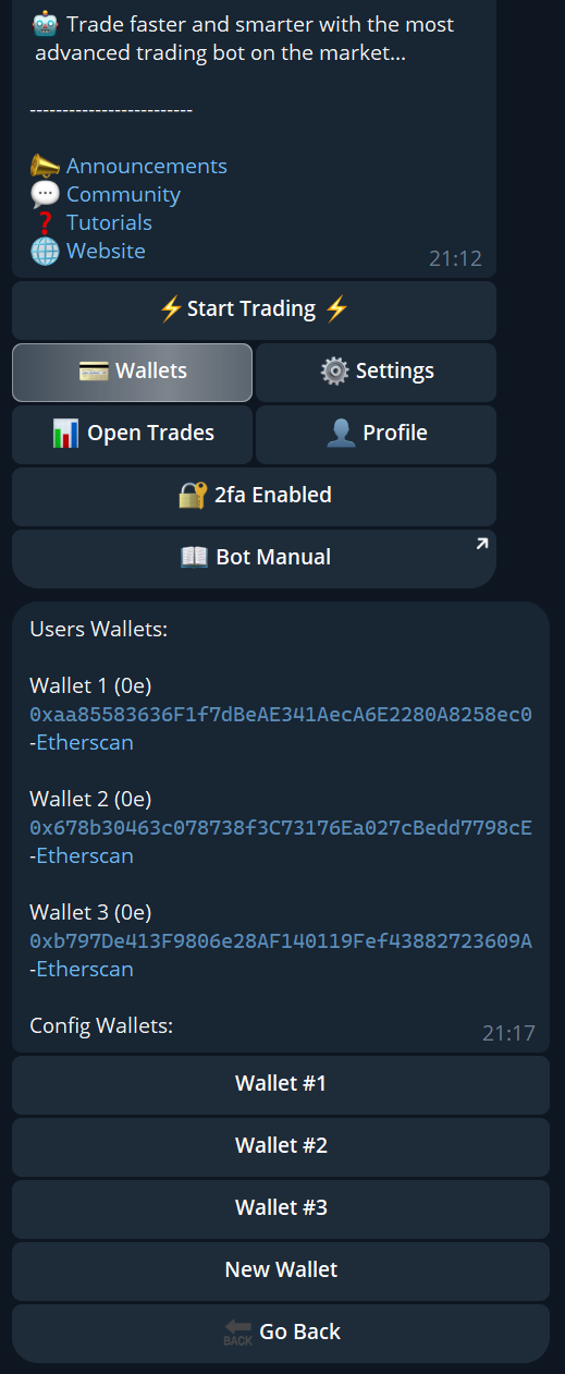 After you have funded your wallet, you can then go back to the main menu and click the button β‘οΈ Start Trading β‘οΈ and it will take you to the menu.