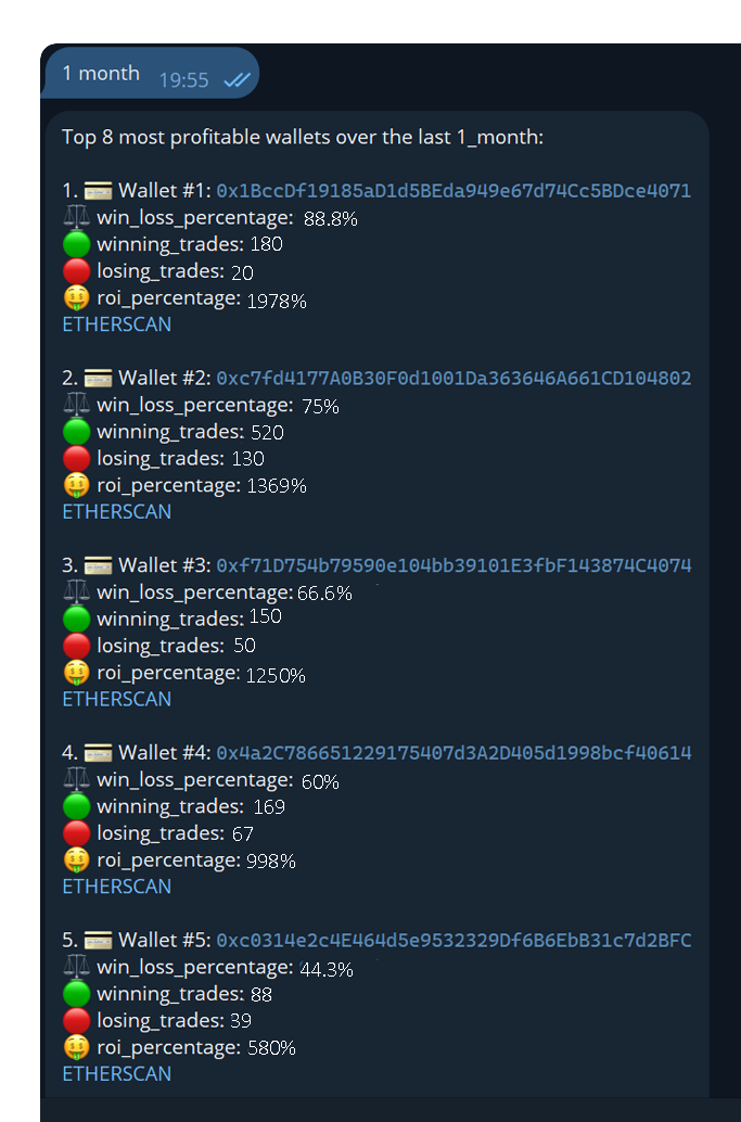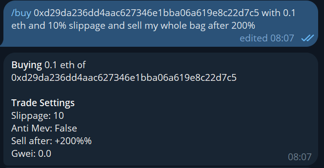 You can easily navigate the bot's complex functions with simple prompts. Just simply write /buy followed by any combination of your strategy and the bot's available features and settings to have AI create your order.