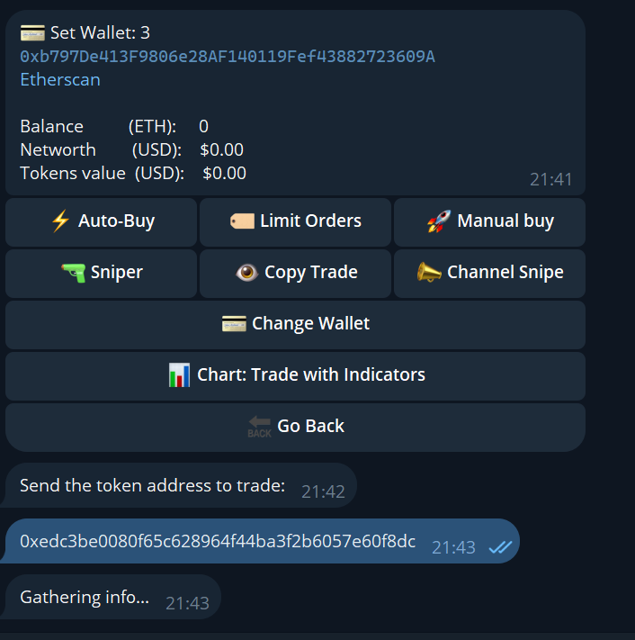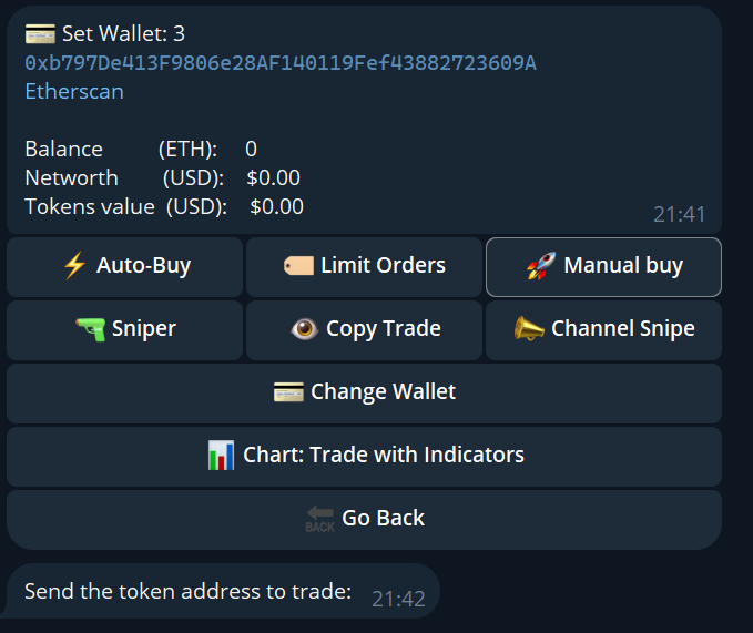 From here, you can click on the π Manual buy to set up your first trade, followed by pasting a contract address. Or alternatively you can choose another trading style like limit order, setup channel sniping, trade by charting & indicators, set up copy trading, or snipe a token.
