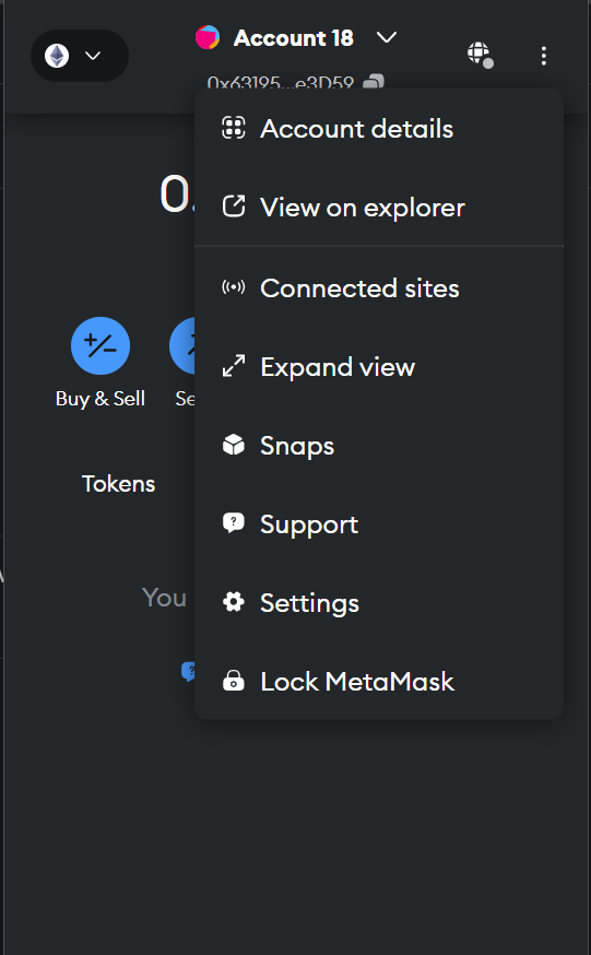 So first, open up your Metamask in the browser extension. And click on the 3 dots on the right hand top side.